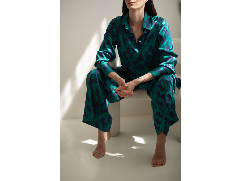 Key to it’s luxurious and comfy feel is our 22-momme 100% pure Mulberry silk satin in custom made verdant panther print. It promises a soft, smooth feel against your skin, making every moment in it a special one.